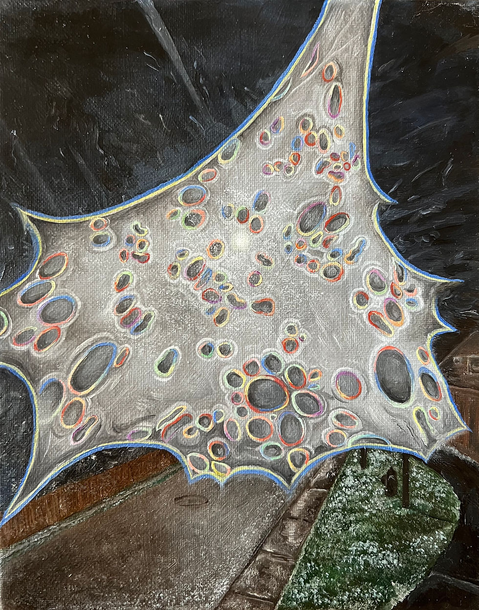 "Snowflake" February 2025. Oil Paint.8x10 While walking at night in the snow, a snowflake fell on the camera lens, creating an organic and surreal reference image